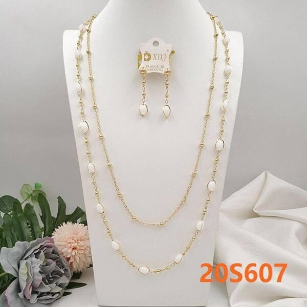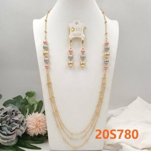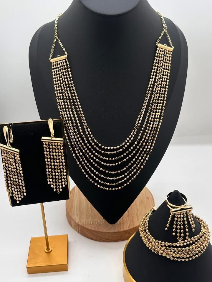 Découvrez l’élégance intemporelle de cet ensemble de bijoux en plaqué. parfait pour illuminer votre style. Cet ensemble harmonieux comprend un collier multi-rangs, des boucles d’oreilles pendantes , tous conçus pour capturer la lumière et attirer les regards