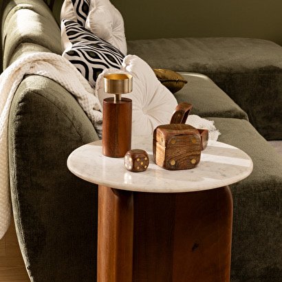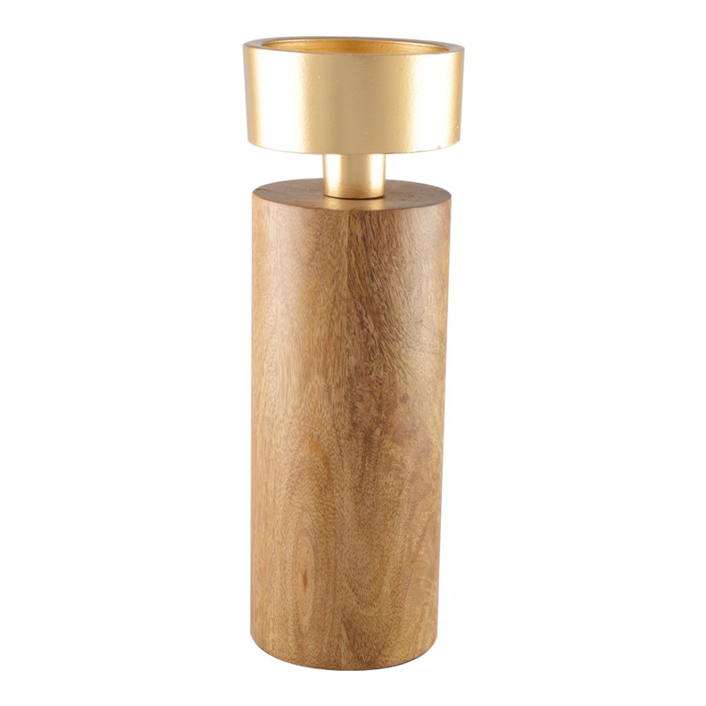 - Design : Son design épuré et contemporain est caractérisé par une base cylindrique en bois naturel et un support pour bougie en métal doré, offrant un contraste visuel saisissant.