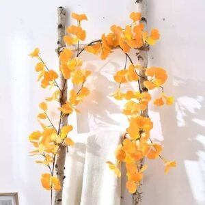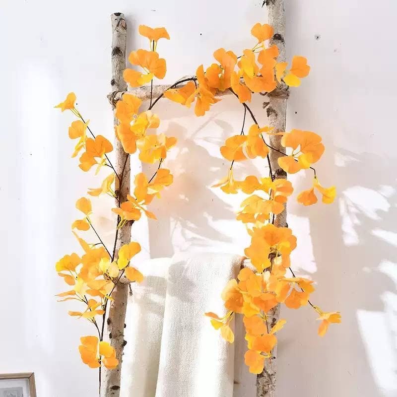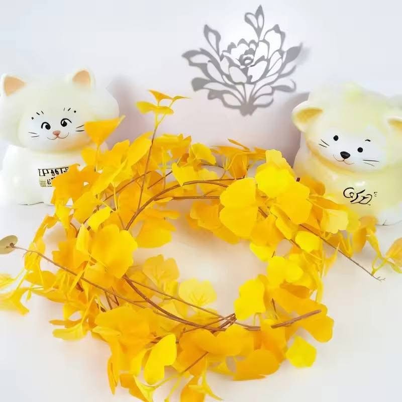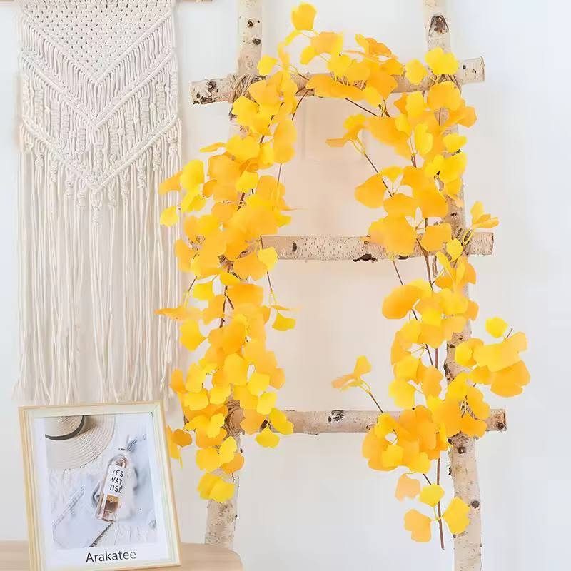 Ceci est une guirlande de feuilles de ginkgo artificielles de couleur jaune.