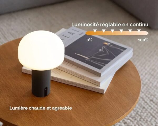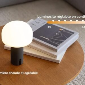 - La lampe est tactile et rechargeable, offrant une grande liberté d’utilisation sans fil. Elle est également dimmable, permettant de régler l’intensité lumineuse selon vos besoins.