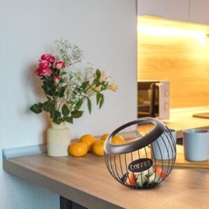 Ce panier de rangement sphérique en métal noir présente un design épuré et contemporain qui s’harmonise parfaitement avec n’importe quel décor de cuisine.