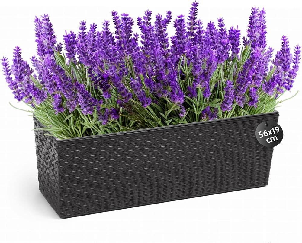 - Dimensions : Avec ses dimensions de 56 x 19 cm, elle est conçue pour accueillir plusieurs plantes et fleurs, comme la lavande représentée, tout en optimisant l’espace.