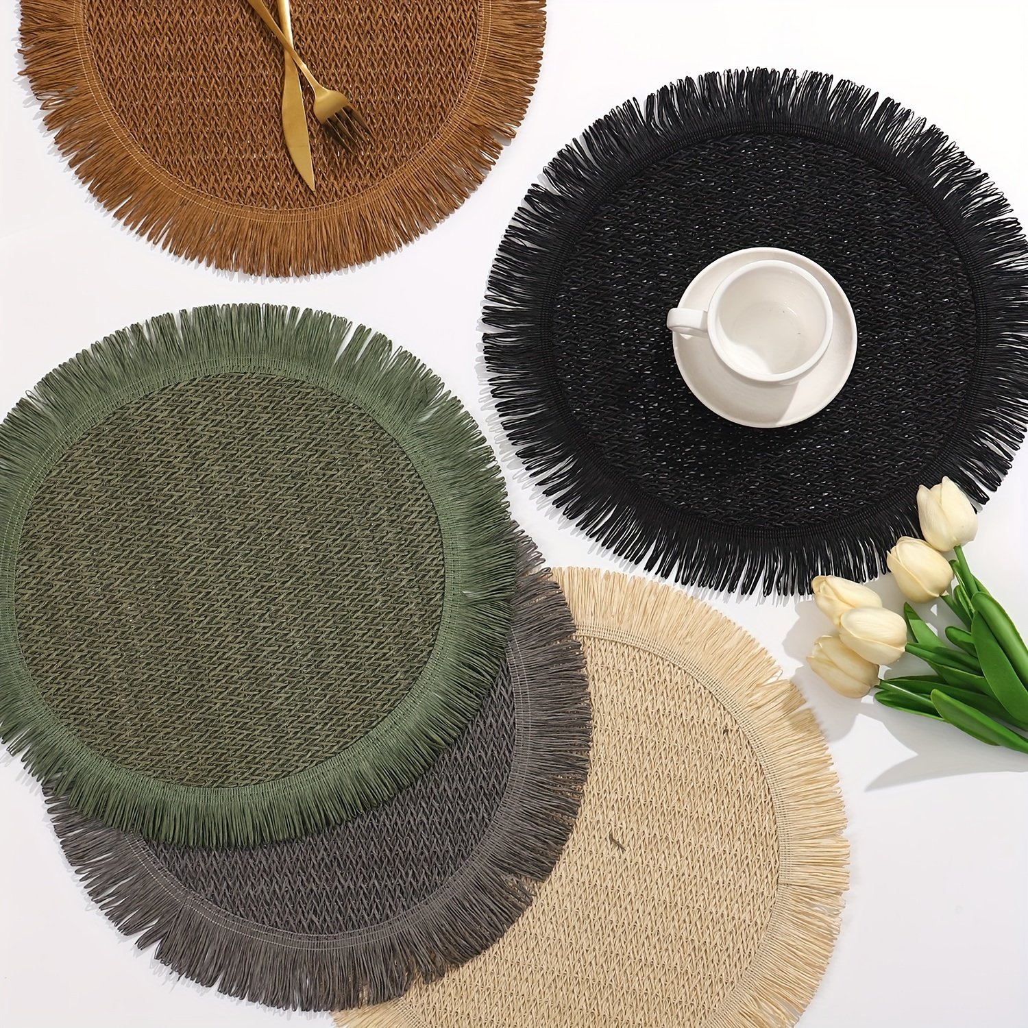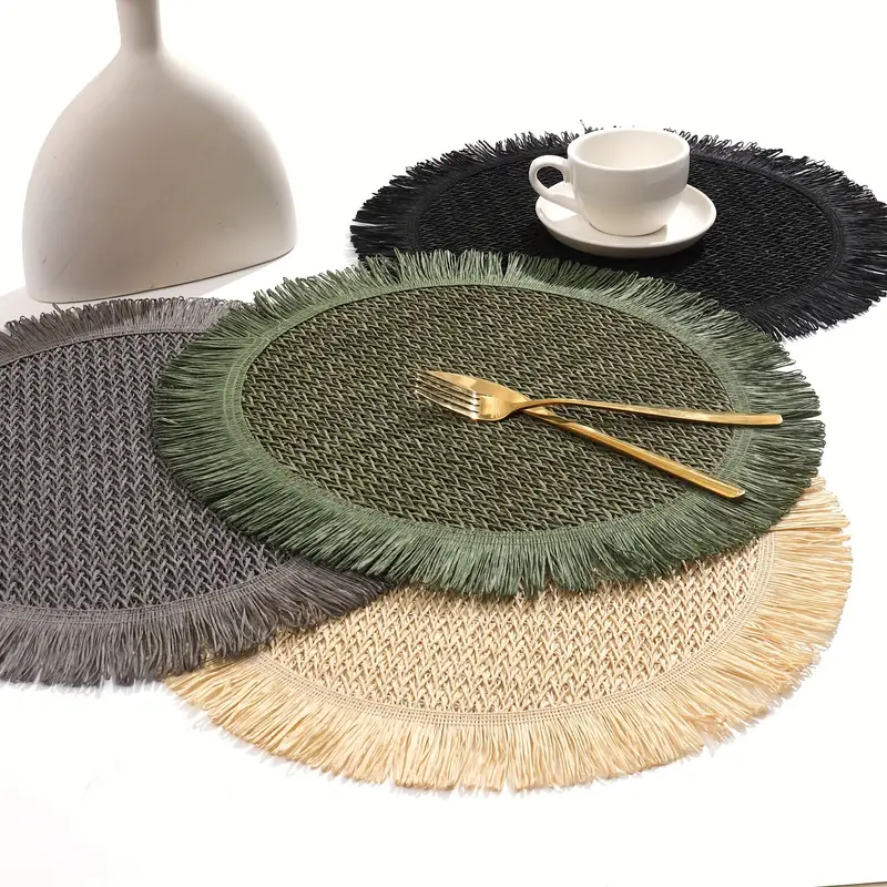 Il s’agit de sets de table ronds bohèmes en papier raphia avec des franges.