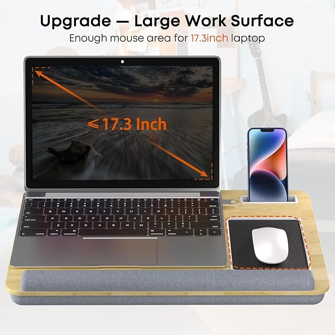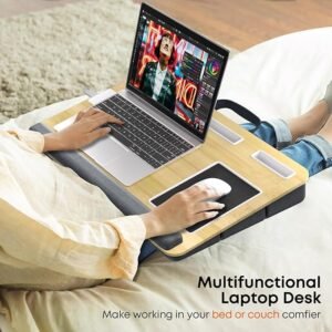 - Caractéristiques : Surface en bois, coussin intégré pour le confort et la stabilité, poignée de transport, et une fente pour tablette ou téléphone.